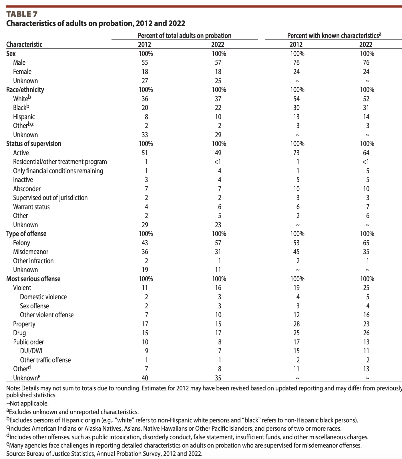 Among adults on probation whose type of offense was known, 65% were on probation in 2022 due to a felony, up from 53% in 2012.