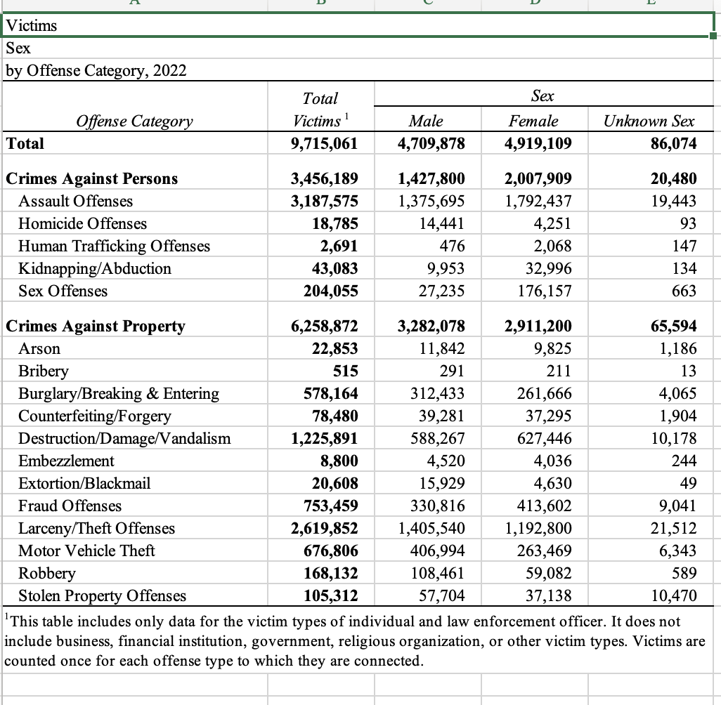 The bottom line? Contrary to prior years per the National Crime Victimization Survey, females have higher rates of “serious” violent victimization. Per the FBI, females have higher totals for violent crime.