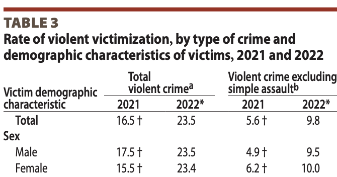 For what the Bureau of Justice Statistics calls “serious violent crime” (excluding simple assaults) females had higher rates than males for 2021 and 2022.