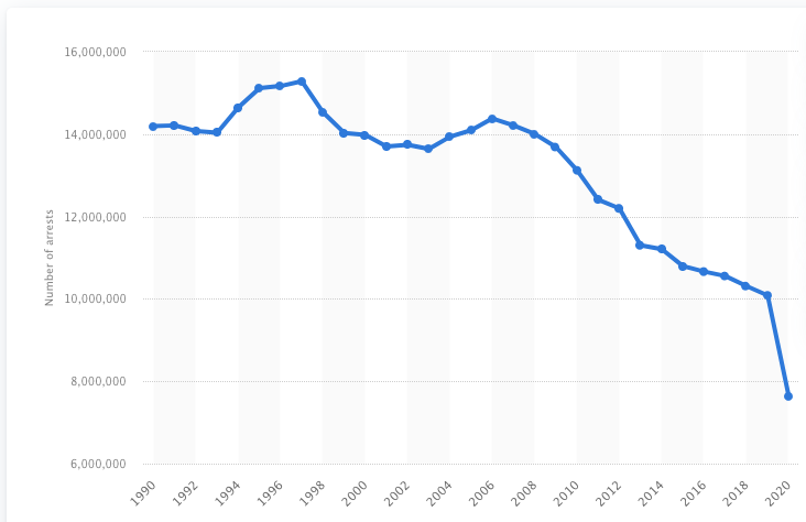 Arrests began declining in 2007 concurrent with a twenty-year-plus reduction in crime and high rates of incarceration. Starting in 2014-2015, per the Bureau of Justice Statistics, violent crime and serious violent crime started increasing. Growth in crime ran concurrently with the Baltimore riots over the death of Freddie Gray and Michael Brown Ferguson and the unceasingly negative media coverage of policing.