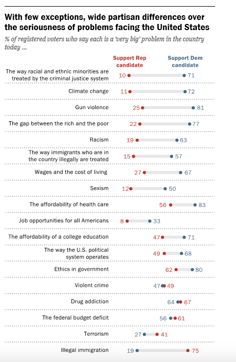Data from Pew provides a list of national priorities based on the support of Democrats and Republicans. At first glance, it’s obvious that the parties do not agree on much.
