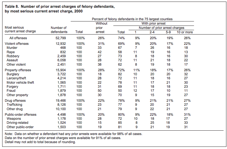 Seventy-four percent of all defendants had at least one prior felony or misdemeanor arrest.  Among defendants charged with a violent offense, robbery (73%) and assault (72%) defendants were more likely to have an arrest record than those charged with murder (67%) or rape (58%).