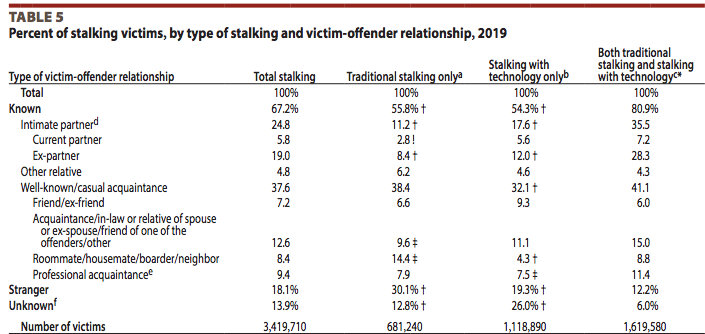 Victims of both types of stalking in 2019 were more likely to be stalked by an intimate partner (35%) than victims of only traditional stalking (11%) or only stalking with technology (18%).