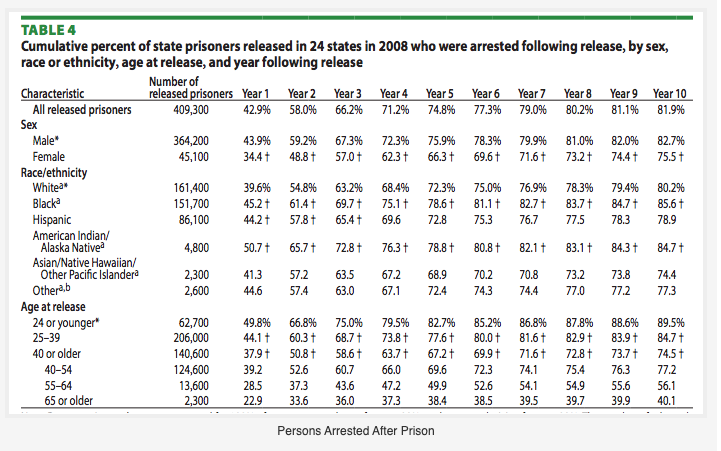 High percentages of older “state” offenders are arrested after release from prison per the above document from the Bureau Of Justice Statistics.