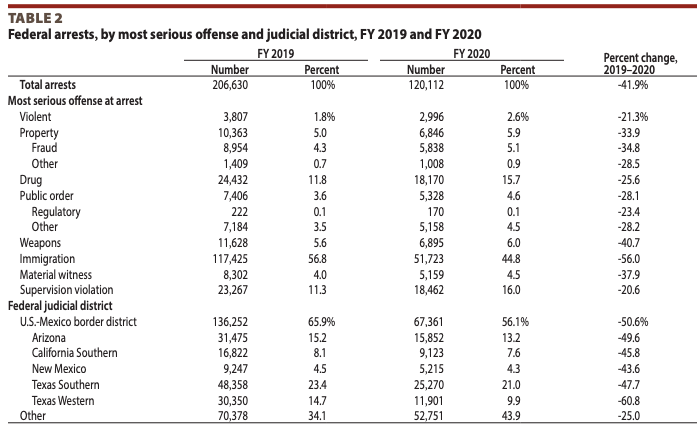 Federal arrests declined 42% from fiscal year (FY) 2019 to FY 2020, reaching their lowest level since FY 2001. The largest percentage decrease in arrests from 2019 to 2020 was for immigration offenses (56%), while the smallest was in arrests for supervision violations (21%). More than half (56%) of arrests in FY 2020 were in the five federal judicial districts along the U.S.-Mexico border.