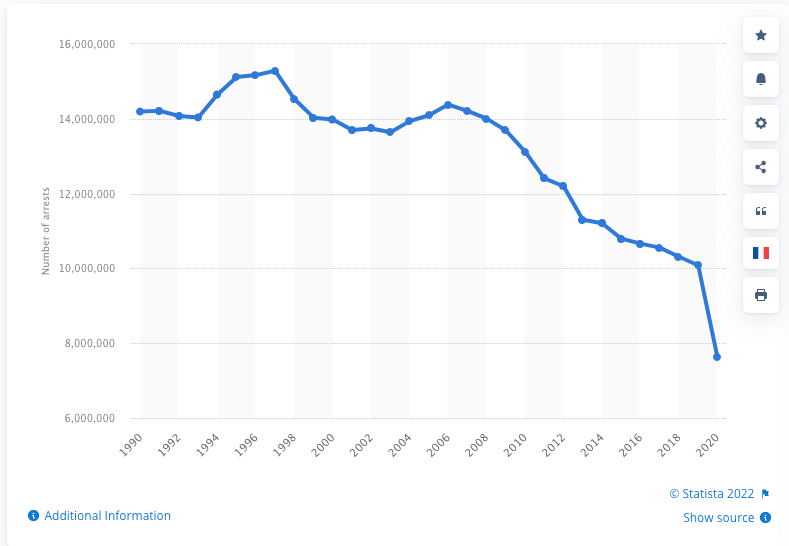 As the Statista chart indicates, arrests have fallen by more than half since the peak year of 1997, from 15,284,000 to 7,632,000 in 2020.